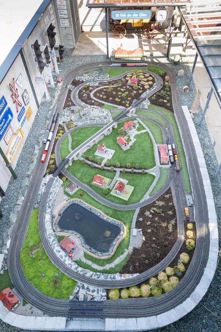 Auf ca. 100 Quadratmeter verkehren vier Züge gleichzeitig, eingebettet in eine schön gestaltete Landschaft. Häuser, Viadukte, Kirchen, ein Tunnel, eine Burg, Brücken, ein Teich sowie der St. Veiter Bahnhof u.v.m. können vor Ort bewundert werden.
