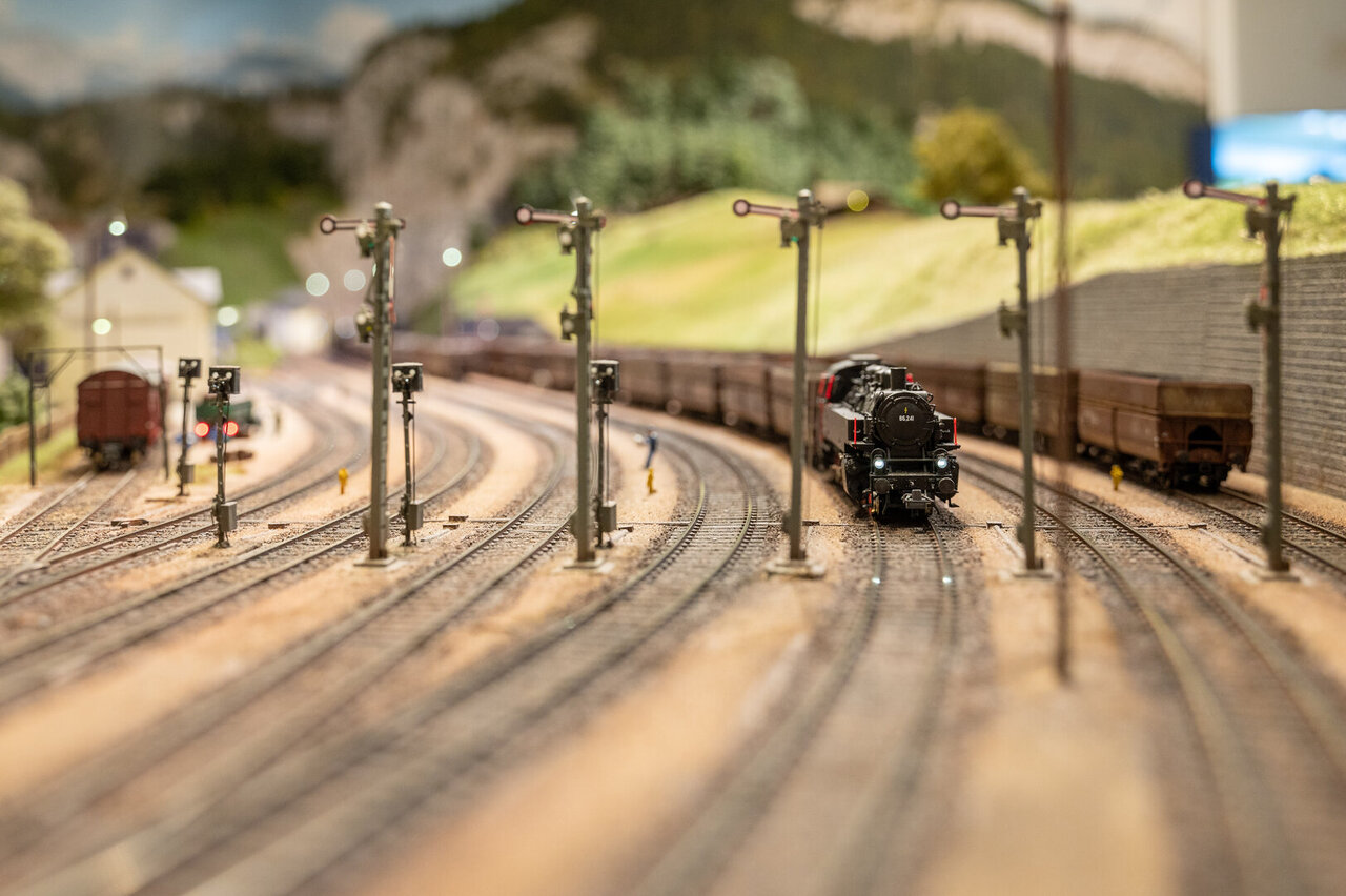 Alle Weichen sind mit voll funktionsfähigen und beleuchteten, vorbildgerechten Weichenlaternen ausgestattet und werden ebenso wie die Signale und Sperrschuhe mittels Servos angetrieben. Die umgebaute Fleischmann Drehscheibe wird mittels Schrittmotor angetrieben so dass auch im Heizhaus ein vorbildgerechter Betrieb stattfindet.