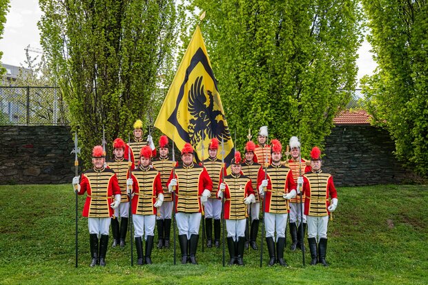 Kaiser Karl VI hat 1715 anlässlich seine Besuches in St. Veit der Trabantengarde - ob ihrer 350jährigen treuen Dienste dem Hause Habsburg gegenüber - die 6, 25 m² große Seidenfahne mit dem österreichischen Doppeladler, bekrönt mit dem Kärntner Herzogshut, verliehen. Sie ist die größte Schwingfahne Europas.