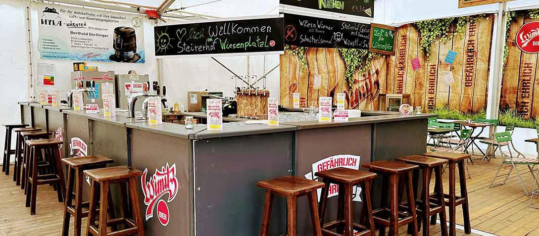 Gemütliches Platzl mit besonders viel Steirerhof Flair. "Auch hier bedienen wir Euch persönlich", beschreiben Karina und Markus Buchegger. "Bei uns gibt’s wie gehabt, das ,gefährlich ehrliche' Wimitz Bier, Märzen, Lemisch sowie das traditionelle Wiesenbier vom Pfiff bis zur Maß. Ebenso Wein, Alkohlfreies und Spirituosen in feinster Auswahl."