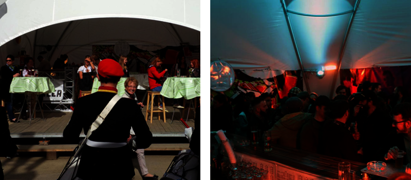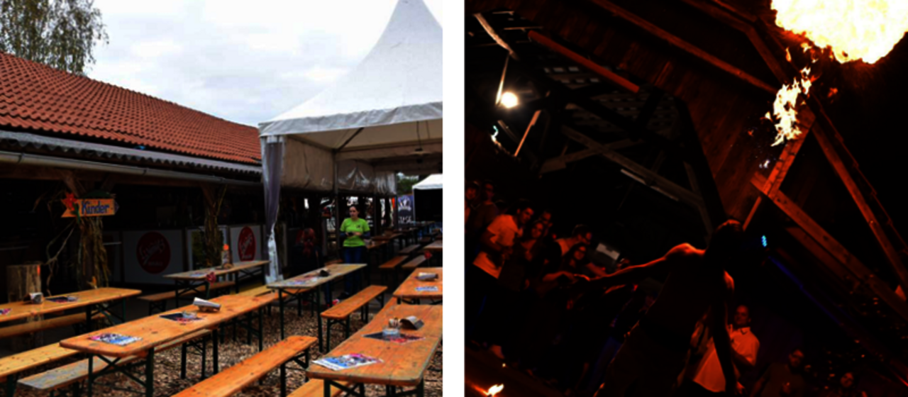 Das Festzelt mit gemütlicher Atmosphäre im Stadl-Design verfügt über ein professionelles Ton- und Lichtsystem. LED-Videowalls verleihen dem Zelt einen modernen Charakter. Ein hochmotiviertes und freundliches Bar und Servicepersonal serviert verschiedenste Getränke und folgende Speisen: Backhendl mit Kartoffelsalat, Schweinsbraten mit Knödel und Sauerkraut, Kärntner Käsnudeln mit Salat und Weißwurst mit Brezel