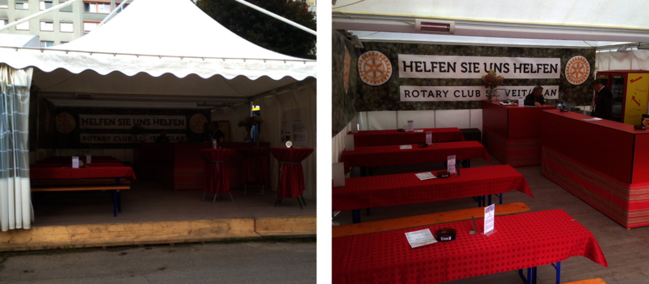 Essen und trinken für einen guten Zweck! Der Rotary Club St. Veit betreibt wie in den vergangenen Jahren am St. Veiter Wiesenmarkt einen Buffetstand gegenüber dem Autodrom Pötscher. In gemütlicher Atmosphäre werden vorwiegend regionale Produkte angeboten. Die Bedienung erfolgt durch die Clubmitglieder und ihre Familien.