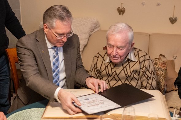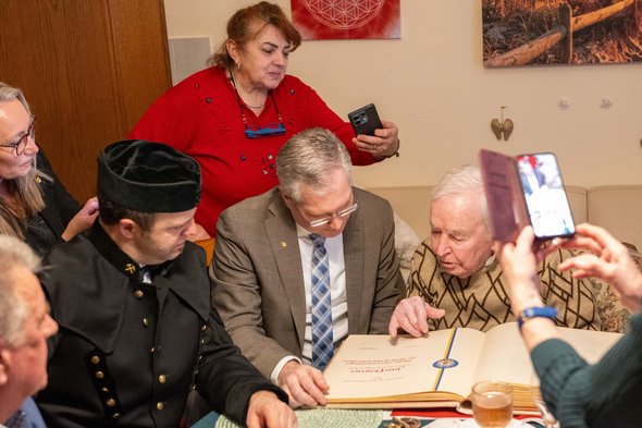 Zu diesem besonderen Ehrentag besuchte Bürgermeister Martin Kulmer den Jubilar persönlich, um ihm die herzlichsten Glückwünsche der Stadtgemeinde zu überbringen und ihm eine besondere Ehre zuteilwerden zu lassen: den Eintrag in das Goldene Buch der Stadt St. Veit als aktuell ältester von rund 12.230 Bürger:innen, was Josef Karner mit großem Stolz erfüllt. Er stammt ursprünglich aus Völkermarkt und blickt auf ein beeindruckendes und arbeitsreiches Leben zurück. Sein Arbeitsleben verbrachte er unter Tage – in den Stollen von Bad Bleiberg arbeitete er als Bergmann in Tiefen von bis zu 500 Metern. Mit bloßen Händen baute er Tunnel und Gewölbe, eine körperliche Höchstleistung, die seinen Charakter formte. Auch die schweren Jahre des Krieges, in denen er an der Front am Eismeer im hohen Norden diente, überstand er mit jener Widerstandskraft, die ihn heute noch auszeichnet. Nach seiner Pensionierung zog es Karner nach St. Veit, wo er heute noch in der Glangasse lebt.
