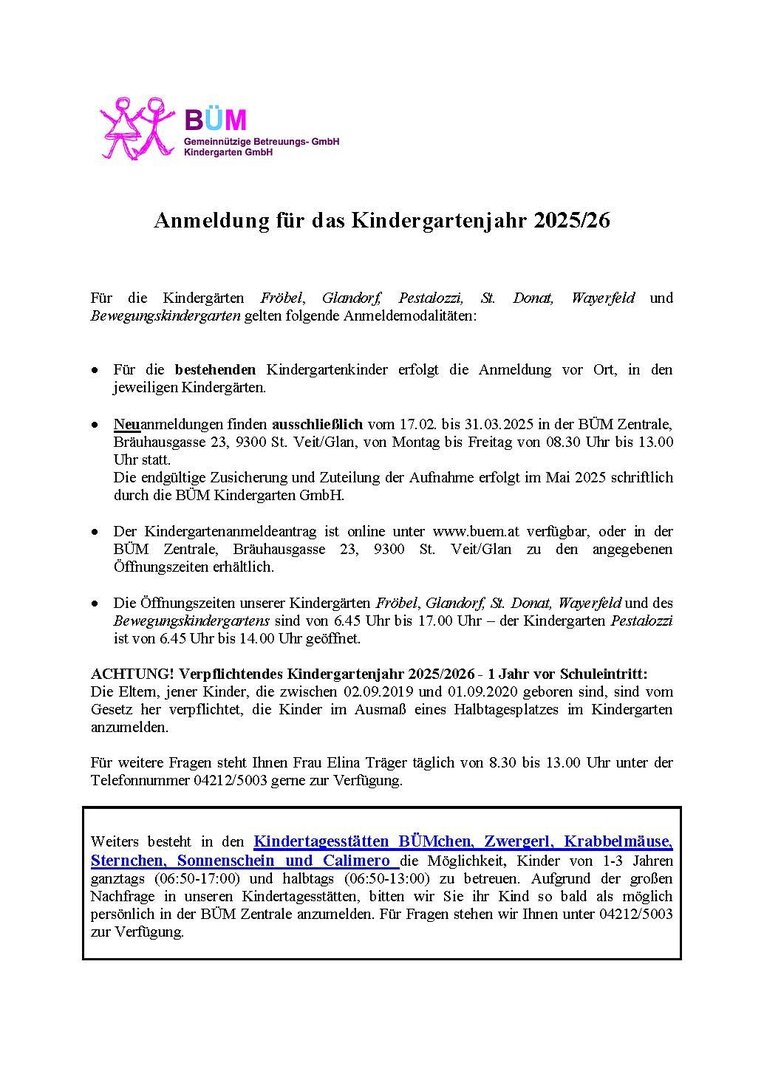 • Der Kindergartenanmeldeantrag ist online unter www.buem.at verfügbar, oder in der BÜM Zentrale, Bräuhausgasse 23, 9300 St. Veit/Glan zu den angegebenen Öffnungszeiten erhältlich.