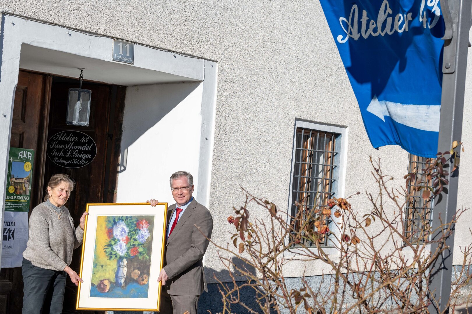 Am Foto vor dem Atelier 43: Galeristin Lieselore Geiger und Bürgermeister Martin Kulmer mit einem Kunstwerk von Karl Stark. Der 1921 in der Steiermark geborene Karl Stark ist einer der Hauptvertreter des österreichischen Expressionismus.
